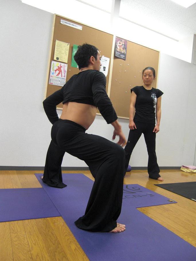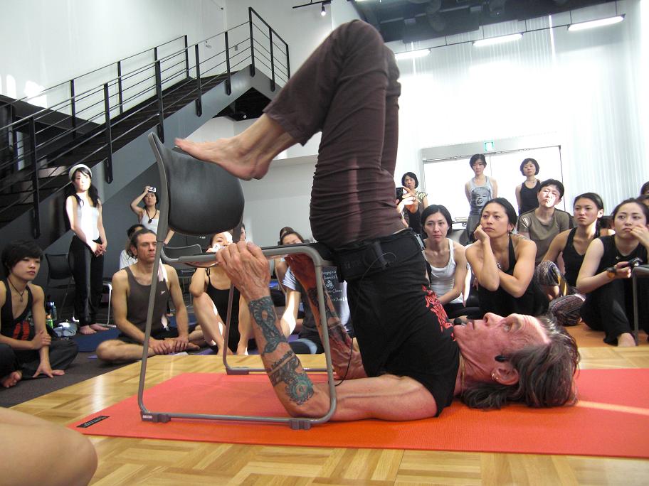 そして、椅子を使ってのアサナの練習もあり、隣の隣ではDankan先生が椅子に挟まってとれなくなるなどの
